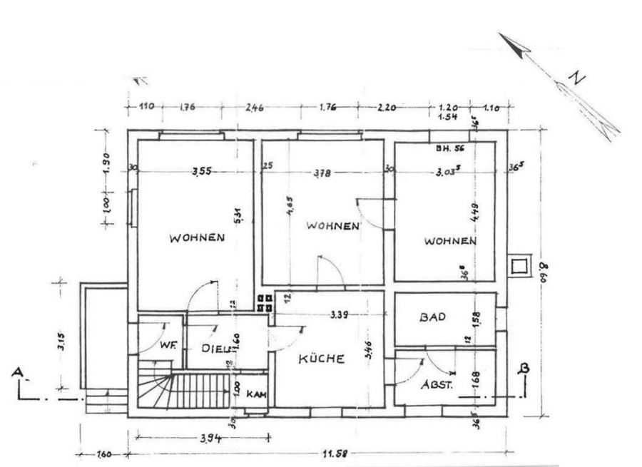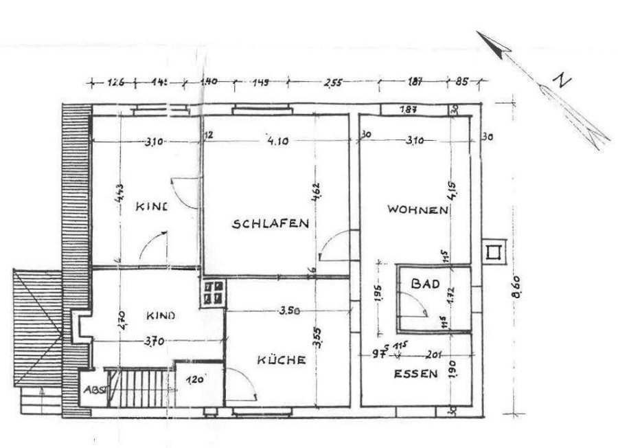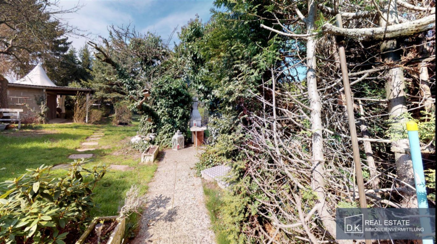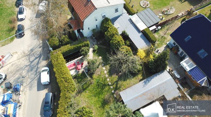 Derzeit befindet sich auf dem großen Grundstück noch ein freistehendes, zweigeschossiges Zweifamilienhaus, welches in massiver Bauweise errichtet wurde, ein Swimmingpool, Saunahäuschen, zwei Terassen, naturbelassene Grünflächen sowie ein alten Schuppen. Durch die steile Dachneigung des Mansarddaches auf der einen bzw. das nur flach geneigte Satteldach auf der anderen Seite ist das Dachgeschoss optimaler nutzbar.