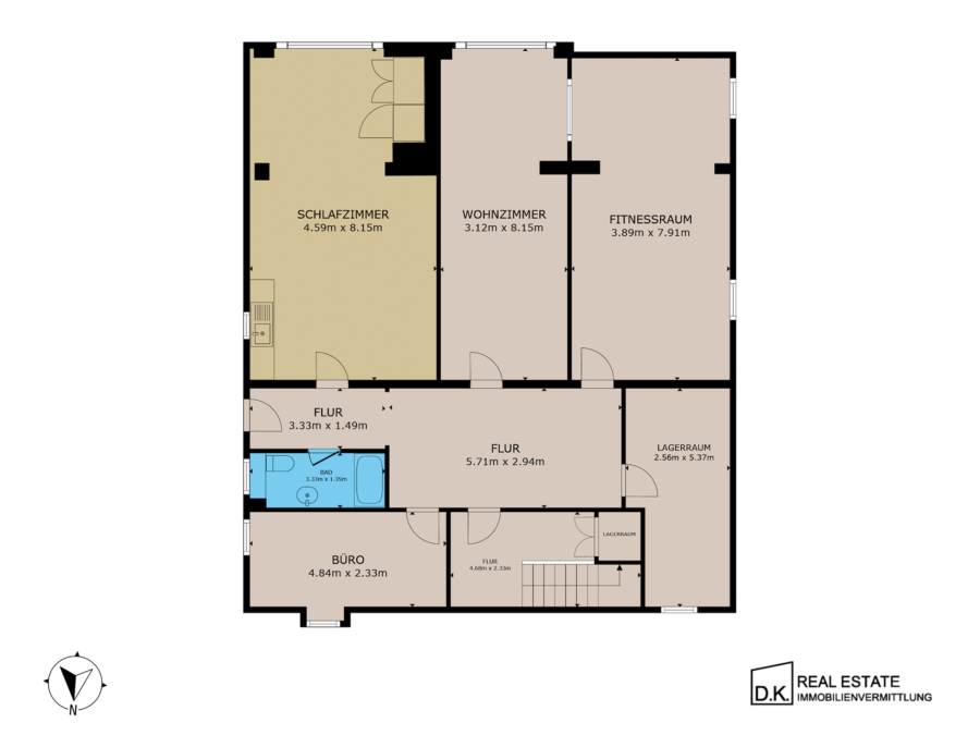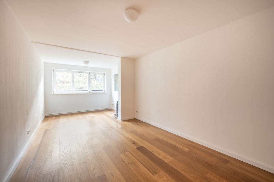 Der voll unterkellerte Bereich profitiert von einer erhöhten Geschosshöhe (2,45 m) und großen Fenstern. Hier befindet sich ein großzügiger Gym- bzw. Hobbybereich, der sich vielfältig nutzen lässt – oder im Rahmen einer separaten Wohneinheit als komfortabler Wohnraum dienen kann.
