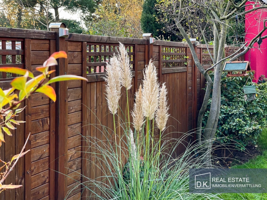 Das Grundstück verfügt neben der großzügigen Auffahrt und dem gepflegten Vorgarten über eine Garage, welche für einen PKW ausgelegt ist. Die Auffahrt bietet problemlos zwei weiteren PKWs ausreichend Fläche. Hinter dem Haus befindet sich der großzügige und stilvoll hergerichtete und gepflegte Garten mit Sonnenterrasse (26m²) und BBQ-Essbereich. Das gesamte Grundstück ist ausgestattet mit liebevoll angelegter Bepflanzung sowie durchdachter Bewässerungs- und Beleuchtungsinstallationen.