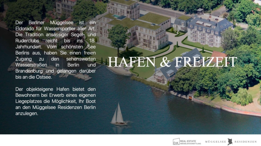 Ein exklusives Anwesen in bevorzugter Wasserlage direkt am Müggelsee. Hierbei handelt es sich um ein stilvolles, von villenartigen Gebäuden geprägtes Wohnensemble der Müggelsee Residenzen Berlin. Auf dem besonderen Grundstück wurde dieses Wohnensemble mit einem Palais, vier Seehäuser, einem Penthouse und 56 hochwertigen Eigentumswohnungen in sechs Gebäuden, ein Concierge-Haus, ein Parkhaus und eine eigene Steganlage für Segel- und Sportboote errichtet.