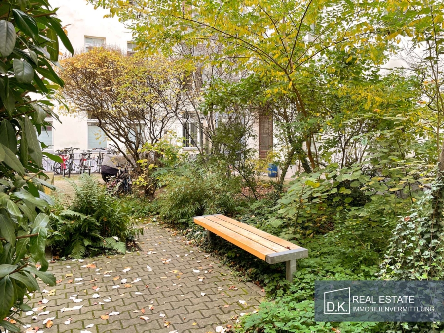 Der schöne und zugleich kinderfreundliche Innenhof bietet neben zahlreichen Fahrradstellplätzen auch einige Sitzmöglichkeiten, sowie einen Sandkasten.