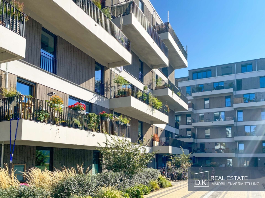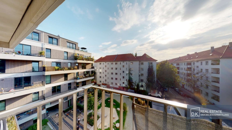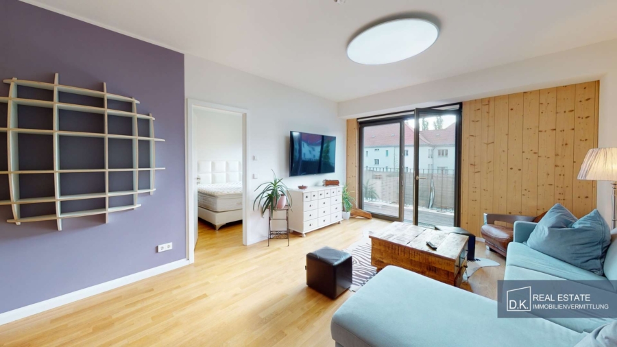 Das großzügig und offen geschnittene 2-Zimmer Apartment präsentiert sich auf insgesamt 62 m² Wohnfläche im 4.OG des besonderen Wohnhauses. Das Wohnzimmer mit der offenen Küche bildet hierbei den attraktiven Mittelpunkt der Wohnung. Von hier aus ist das großzügige Schlafzimmer, ein voll ausgestattetes Badezimmer, ein praktischer Abstellraum inklusive Waschmaschinenanschluss und der große Balkon erreichbar.