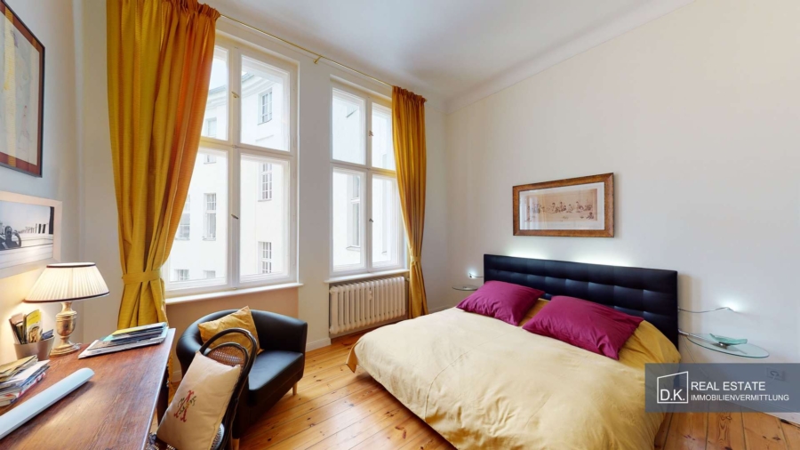 Trotz der Lage an dem lebhaften Hohenzollerndamm bietet die Wohnung durch die Ausrichtung von Küche und Schlafzimmer zum Innenhof eine sehr ruhige Atmosphäre.