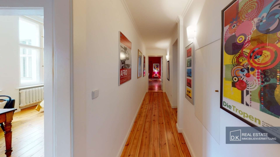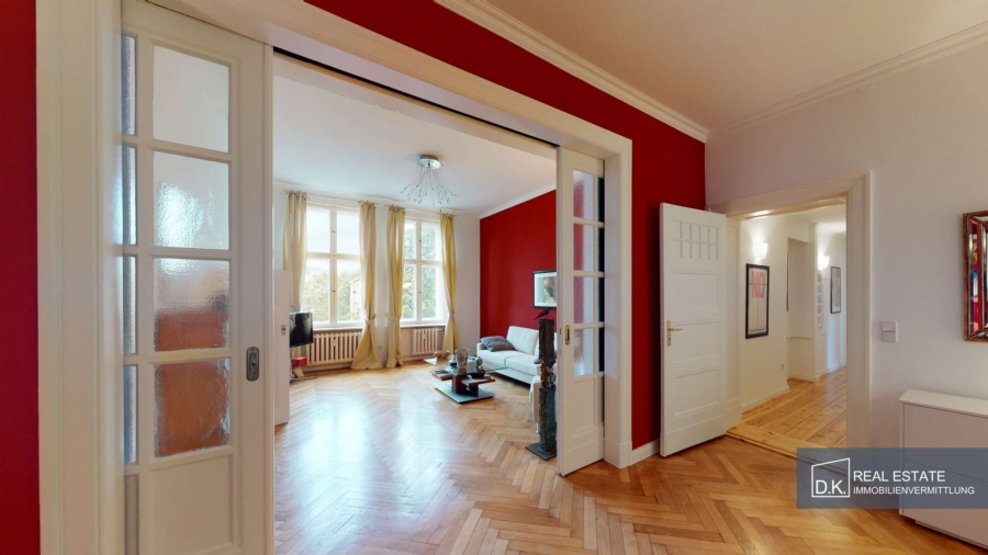 Die Wohnung bietet ca. 89 m² Wohnfläche, die sich über drei Zimmer, ein Duschbad sowie Küche und Abstellraum erstreckt. Die Küche, Bad, Schlafzimmer sowie das Durchgangszimmer mit Schiebetür gehen von dem weitläufigen Flur ab. Der Wohnbereich schließt sich daran an. Hohe Decken und eindrucksvolle Fensterfronten werden von dem gepflegten Fischgrätenparkett sowie dem Dielenboden als typische Altbaustilelemente ergänzt und kreieren in der gesamten Wohnung einen hellen und einladenden Flair. Die Küche bietet neben einer voll ausgestatteten Einbauküche inkl. AEG-Küchengeräte auch genügend Platz zum Aufstellen eines Esstisches.