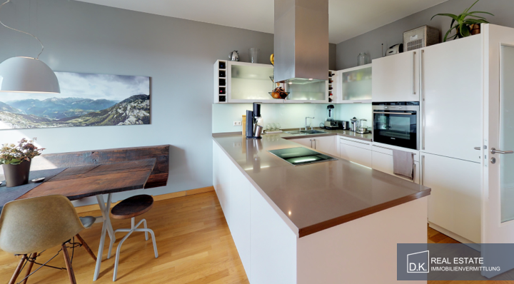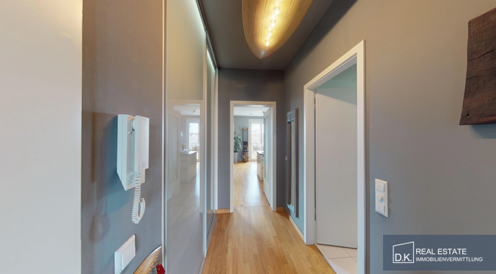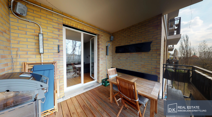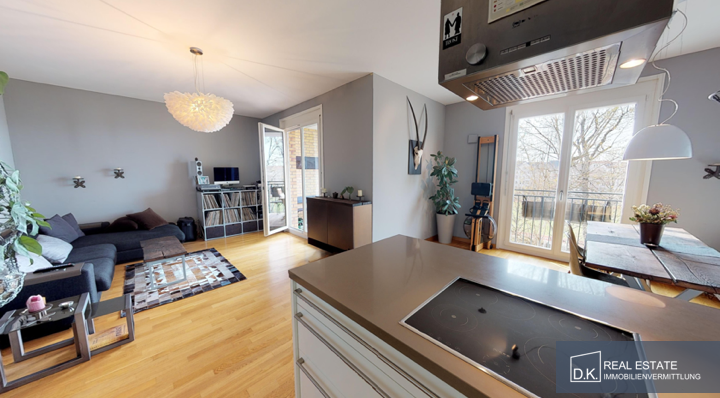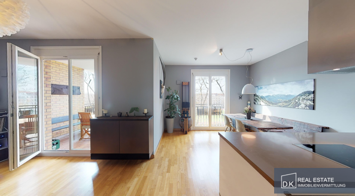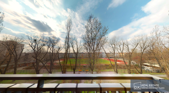 Wir haben genau hier eine traumhafte Wohnung für Sie! Nicht nur direkt am Park, sondern auch mit Blick darauf und weit darüber hinaus: von einer Richtung Westen gelegenen, rund 10m² großen, überdachten und uneinsehbaren Loggia mit dielenartigem Holzboden ebenso wie durch bodentiefe Fenster vom Wohn- und Schlafzimmer aus.