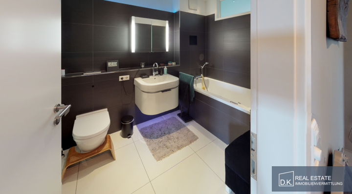 Die Seele baumeln lassen und neue Kraft tanken können Sie auch wunderbar im Luxus-Badezimmer mit Jacuzzi-Badewanne, separater, bodengleicher Dusche und Soundsystem (das ebenso auf der Terasse für Atmosphäre sorgt) sowie im Schlafzimmer, welches neben Platz für ein sehr großes Bett dank maßgefertigter Schiebetüren-Einbauschränke auch viel Stauraum bietet. Der Blick von hier geht in einen großen, sehr gepflegten begrünten Innenhof.